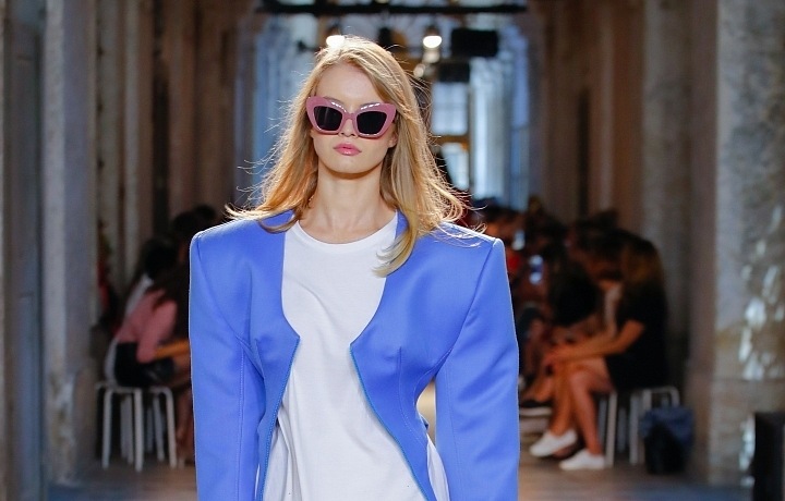 Modré kraťasy do pasu v kombinaci s bílým kabátem a saténovým podprsenkovým topem? Ustupte, královna pláží a léta právě prochází!