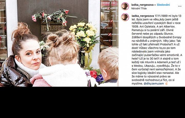 Moderátorka a herečka Laďka Něrgešová si události roku 1989 připomněla u pamětní desky na Národní třídě, kam společně zavítala se svým synem Adamem a dcerou Medou. V době Sametové revoluce jí bylo třináct let.