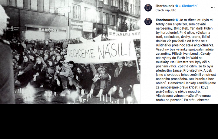 Na 17. listopad zavzpomínal i moderátor Libor Bouček, který v té době vyhlížel své deváté narozeniny. Také on na svém instagramovém účtu vyjádřil svou vděčnost a radost ze svobody.