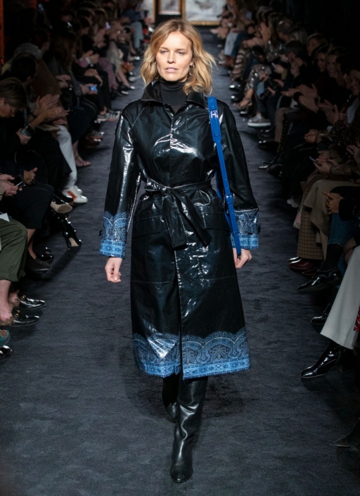 Eva během přehlídky oblékla nejen naprosto luxusní halenku s exotickým paisley vzorem a tříčtvrteční kalhoty do pasu ale i kabát ve stylu pláštěnky. Díky bohu za to, že paisley vzor nechyběl ani tady, jinak by se z lesklého kabátku okamžitě stal pytel na odpadky vhodný tak maximálně na zahradu k chalupě.