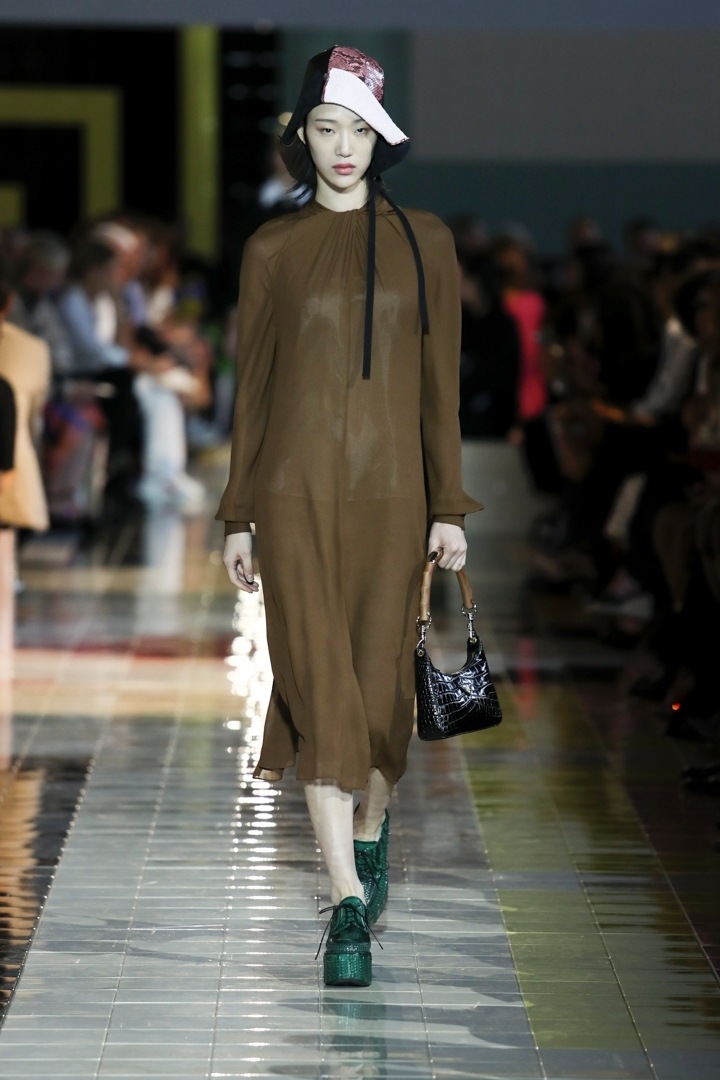 V porovnání s loňskou kolekcí, které vévodily hluboké výstřihy a mini, by se tak mohlo zdát, že se Prada rozhodla ubírat letos konzervativnějším směrem. Není tomu ale tak docela, jedna věc totiž zůstala – transparentní tkaniny, a tak se i v SS20 najde několik žhavějších modelů.