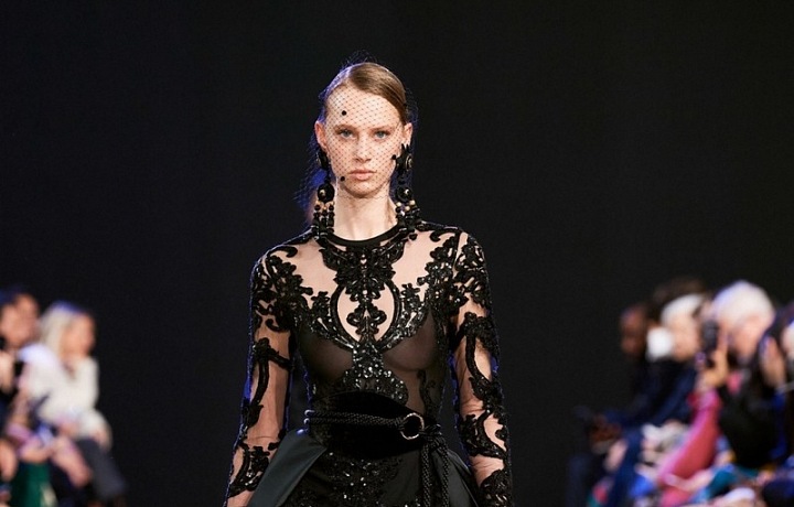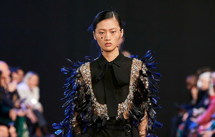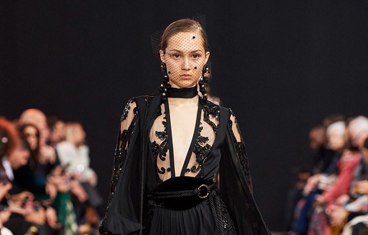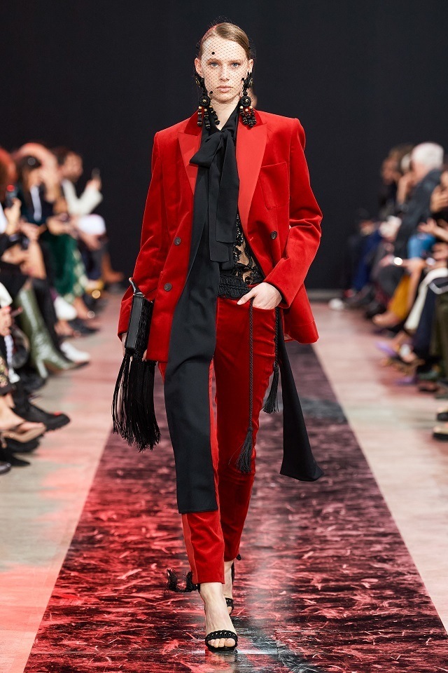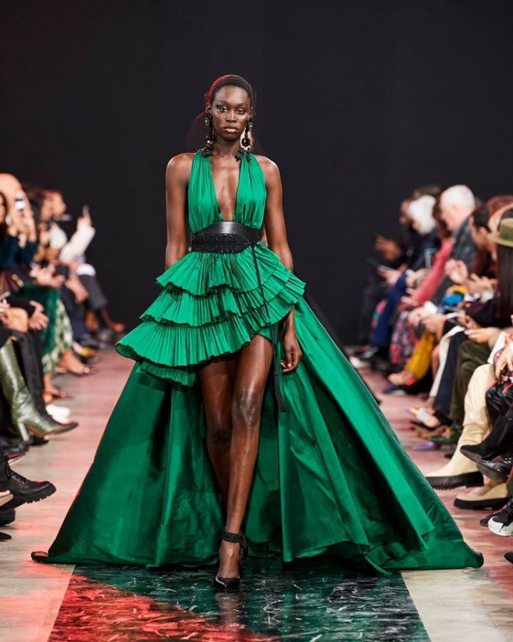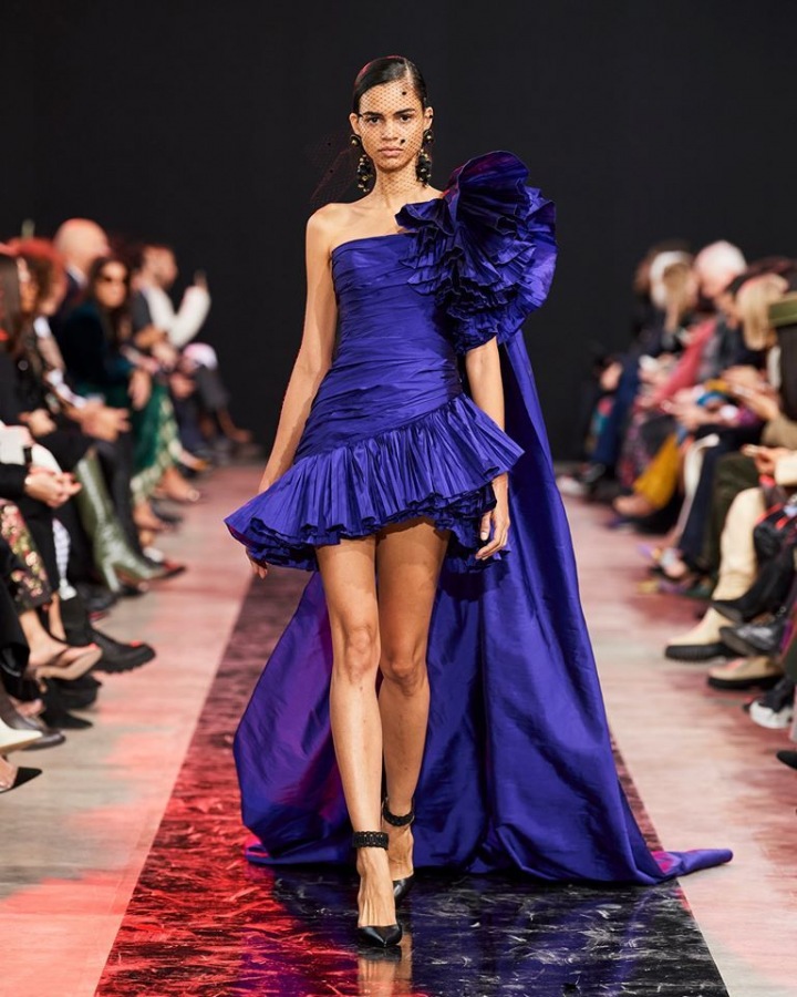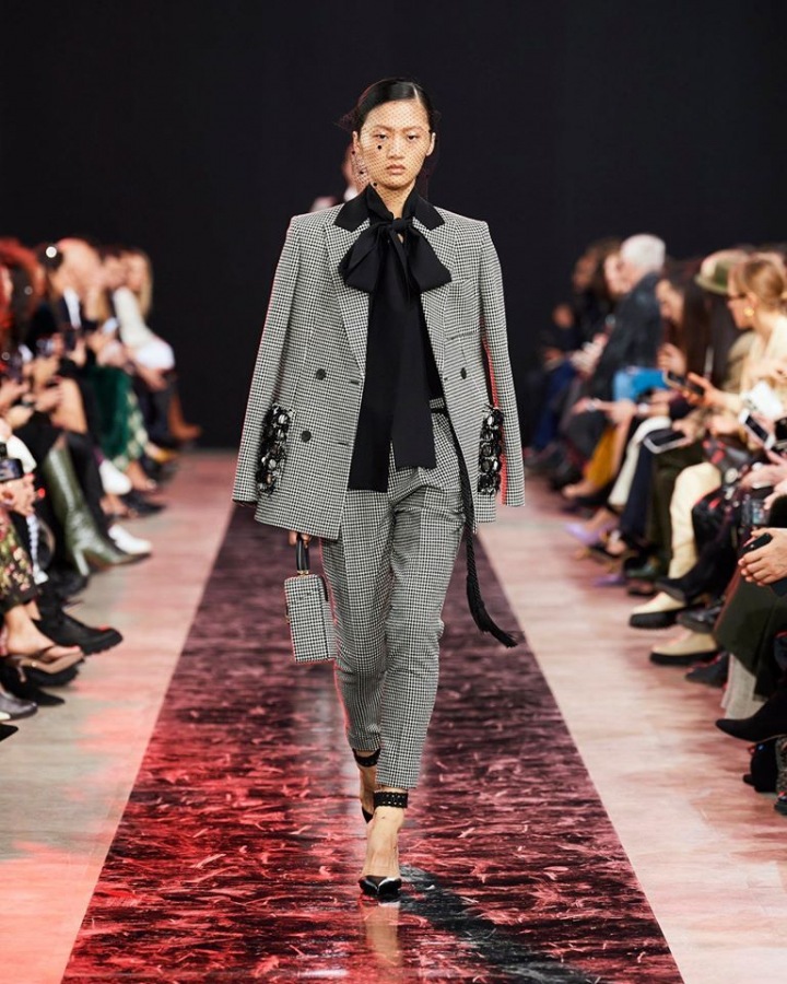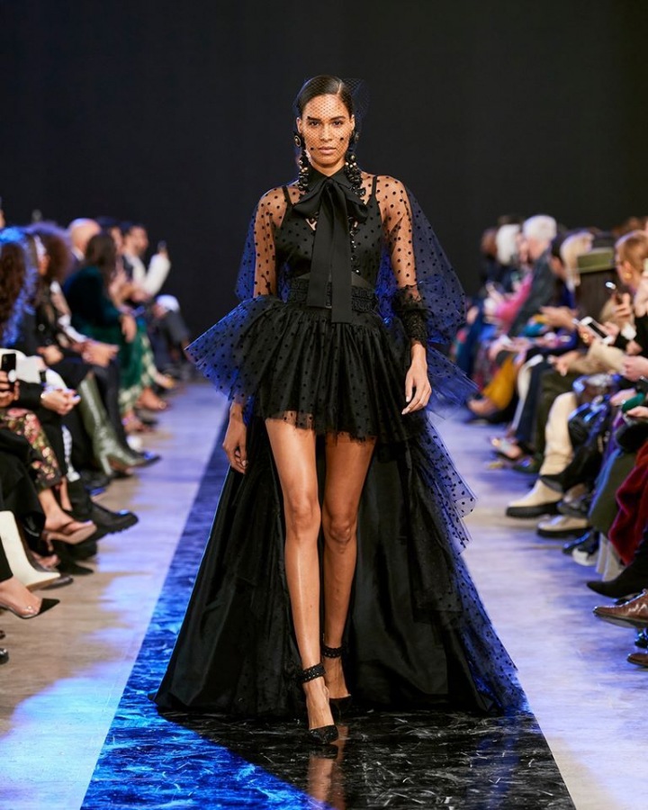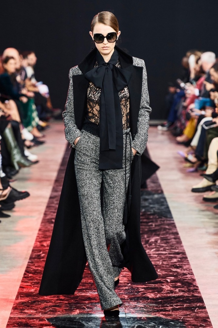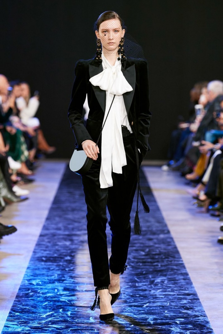 Elie Saab zahájil svou přehlídku, která se uskutečnila v Palais de Tokyo, elegantními a sofistikovanými kostýmky. Ty obohatil o výrazné prvky jako volány, mašle nebo syté odstíny. Mašle se koneckonců staly dominantou vůbec celé luxusní kolekce Fall 2020 a provází ji od začátku do konce.
