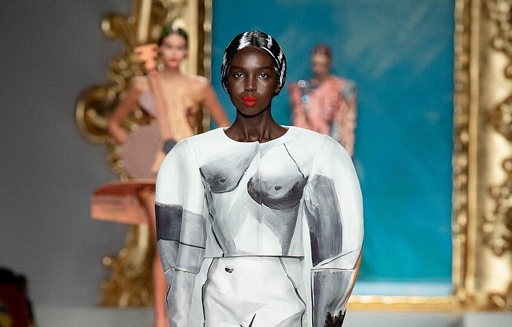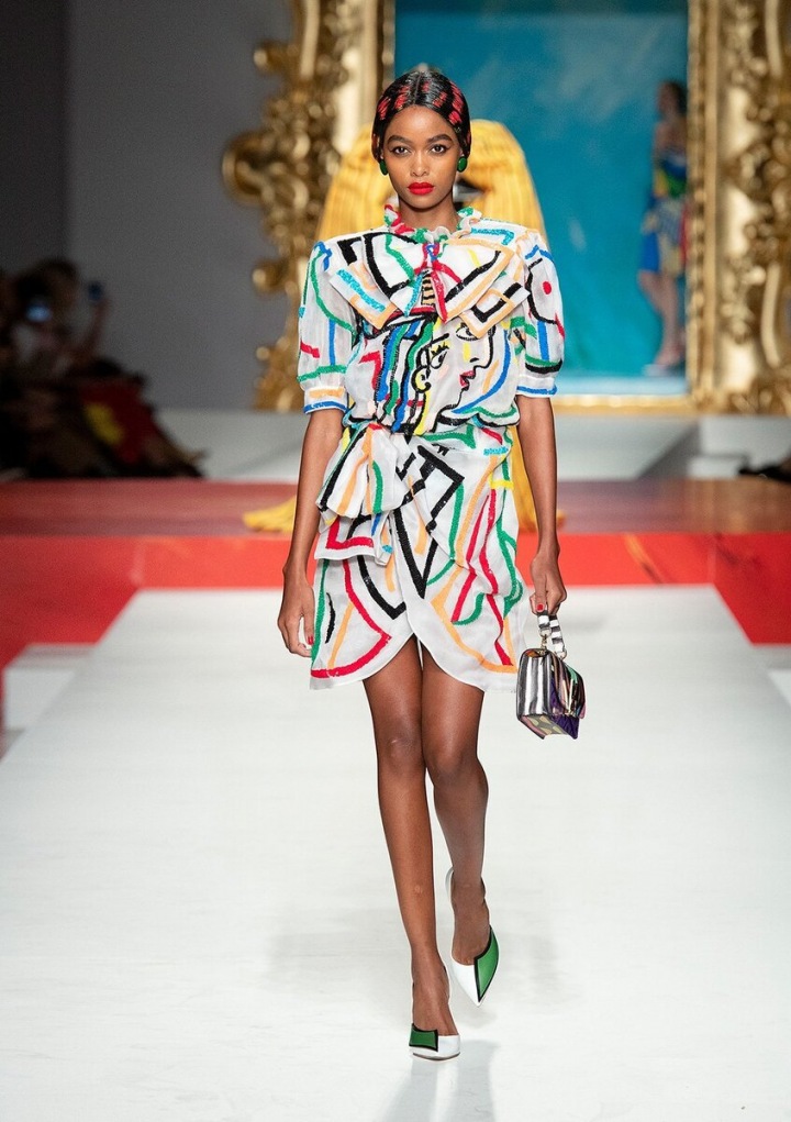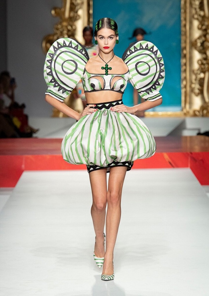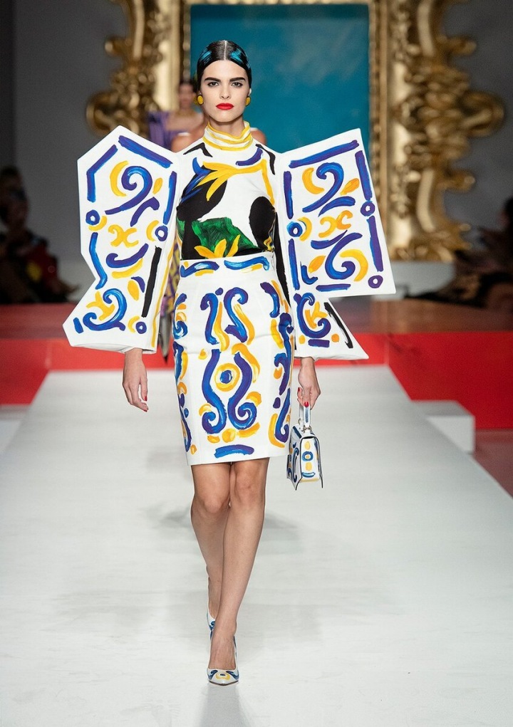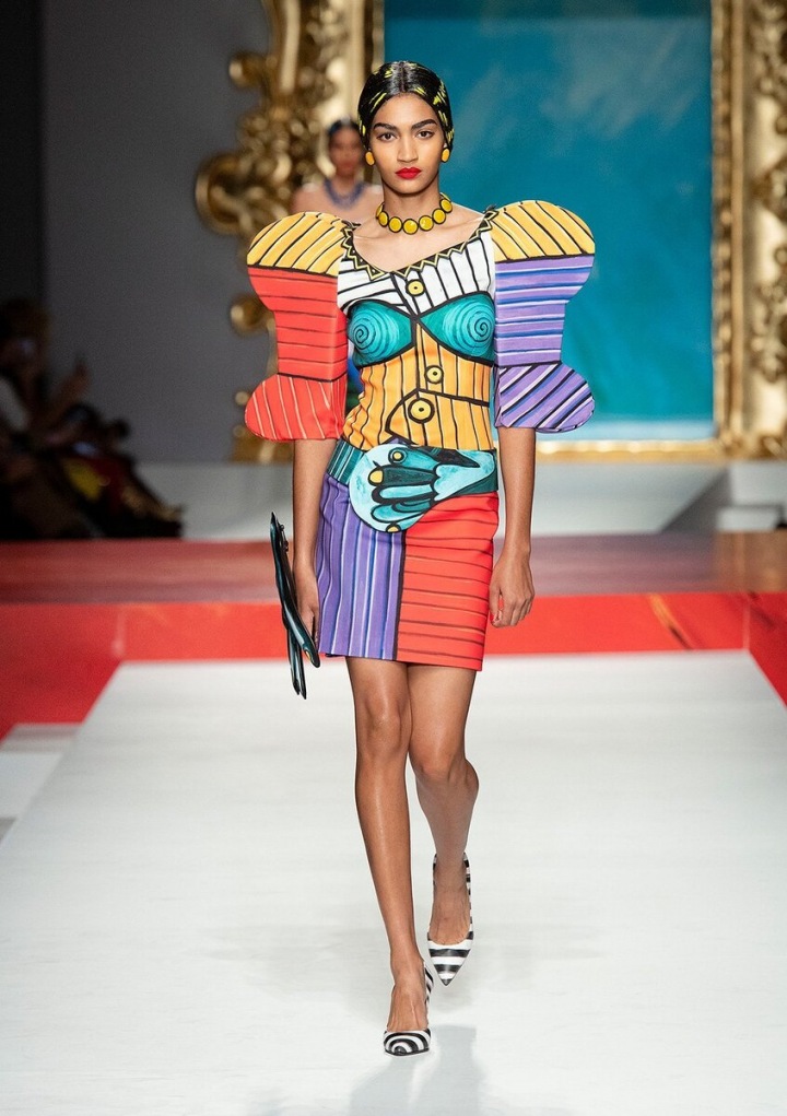 Moschino je pověstný svými eklikteckými barvami a vzory, ale tohle už zavání impresionismem! Jako bych viděla ztělesněné dílo Picassa, no ne? Těžce nenositelý model, i když to jsem si o tý kolekci s Barbie myslela taky a jak se chytila. Každopádně mě baví sledovat podobná umělecká díla na světovém mole, ale v reálu si je představit už moc nedokážu. No schválně, jaký by byly asi reakce lidí na někoho, kdo v tomhke kráčí po nákupech. V posledních letech se většina návrhářů zaměřuje na udržitelnou módu a tohle je spíš plejtvání materiálem, který si nikdy někdo nevezme víc jak 1x.