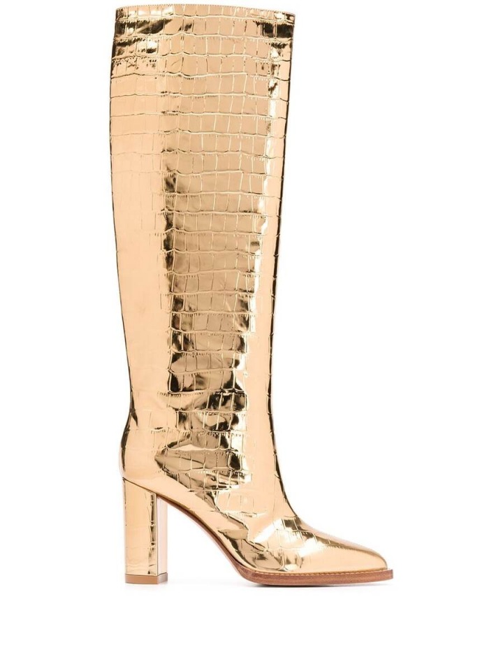 Vlastně se nedokážu úplně rozhodnout, jestli je to právě ta konfeta, nebo frkačka z pouti za kačku. Každopádně jak barvy, tak kopyta jsou v tomhle případě fakt úlet. Šaty nejsou ani úplně šaty, ale možná spíš kabátek, nebo zavinovačka? Těžko říct. No, a taky ta kombinace zlatých kozaček, ve kterých se musejí neuvěřitelně potit nohy, a letních šatů s lodičkovým výstřihem odhalujícím ramínka, mě nechává na pochybách, kdy kam bych takhle vyrazila? No, na maškarní určitě ano, to bych pak čekala i výhru. Ale týden módy, to jako fakt?