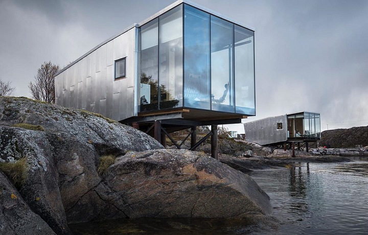 Někdo se bojí výšek, někdo zase vody. Nové středisko na norském ostrově rozhodně není pro každého. Hostům totiž přináší doslova nevšední zážitek z ubytování a to nejen díky své unikátní poloze.  Vyčnívající chatky, které vypadají jako plechové krabice vás doslova vtáhnou do arktických krajin. I když uvnitř nich mohou mít hosté pocit, že jim rozbouřené moře zaplaví kuchyň, architekt umístil každou navrženou kabinu s ohledem na výšku vln a nezapoměl vzít v potaz normální či extrémně povětrnostní podmínky, ale také předpokládané zvýšení hladiny moře v důsledku změn klimatu. Pohled na moře a majestátní hory si tak můžete bez obav užít a jednoduše relaxovat.