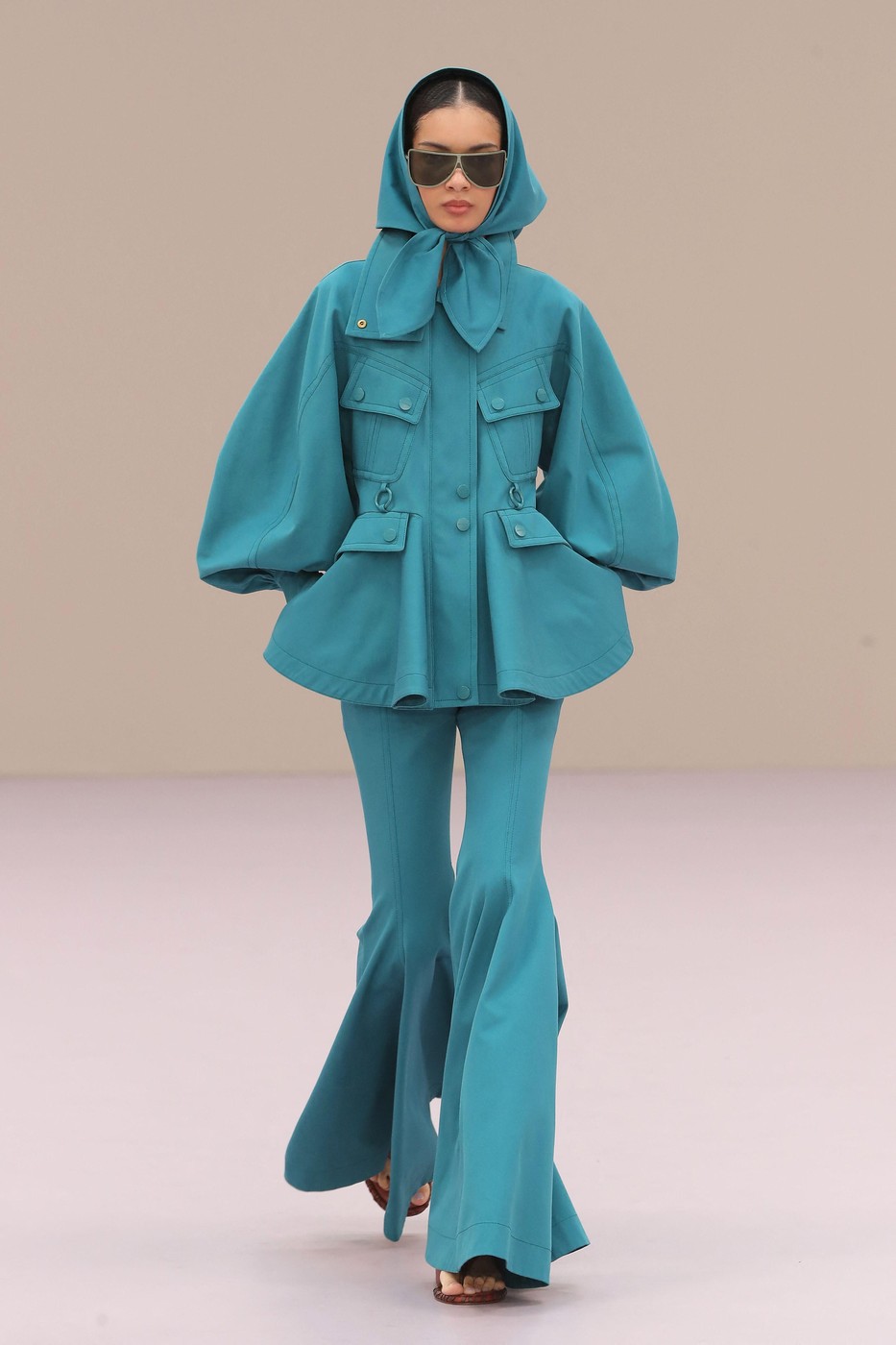 Petrolejová modrá, široké rukávy a pečlivě zdobení si získá snad každého. Celý model byl doplněný o zvonové kalhoty s vysokým pasem, který v posledních letech slaví svůj velký návrat. A ačkoliv ještě nedávno by si mnozí nedokázali představit, že odhodí své skinny jeans, teď v šatníku široké kalhoty nechybí takřka nikomu.