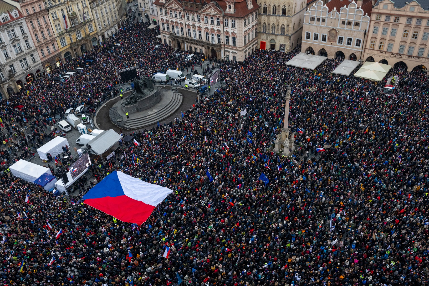 Lidé v Praze zaplnili Staroměstské náměstí a spodní část Václavského náměstí, aby demonstracemi podpořili prezidenta Pavla ve sporu s vládou.