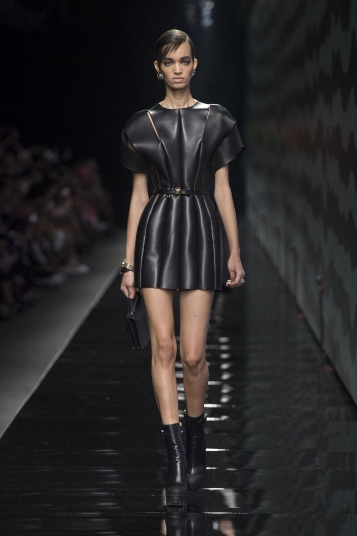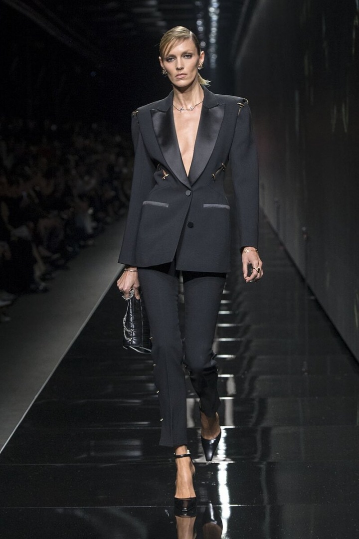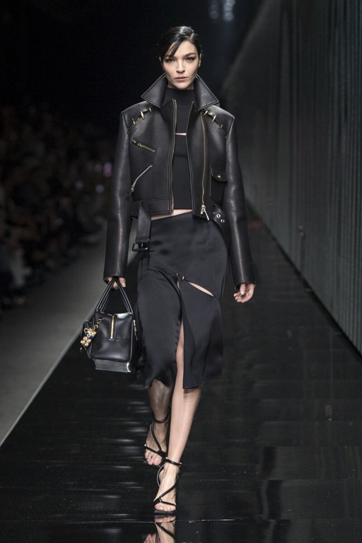 Milujeme černou a milujeme to, co s ní značka Versace tentokrát provedla. Třeba tenhle luxusní smoking s výstřihem až k pupíku, kožené mini šaty, svůdné mini nebo áčková sukně v kombinaci s hnědou koženou bundičkou? To je prostě boží!